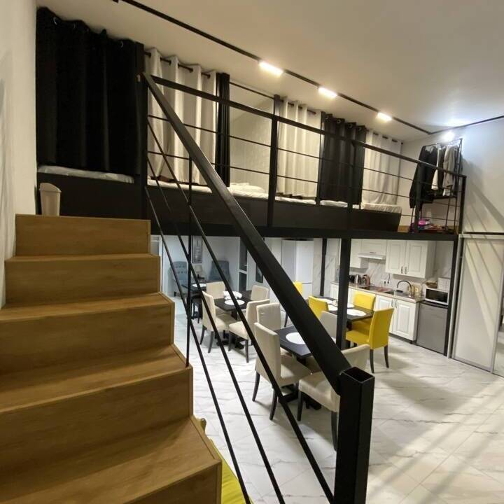 Полноценная кухня-гостинная, где можно приготовить еду. Плита, холодильник, микроволновка, чайник, посуда, кофемашина