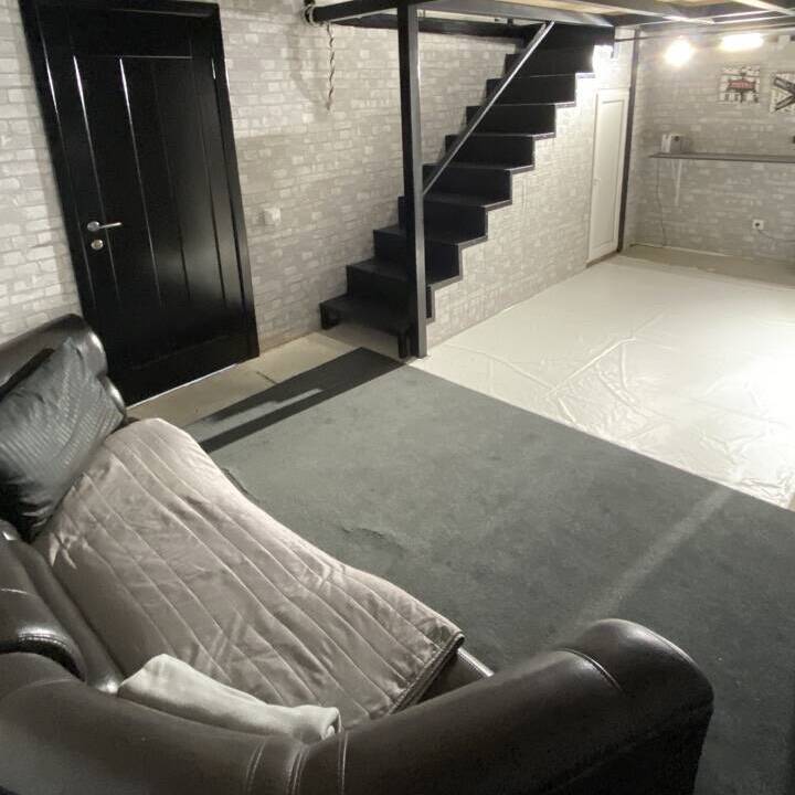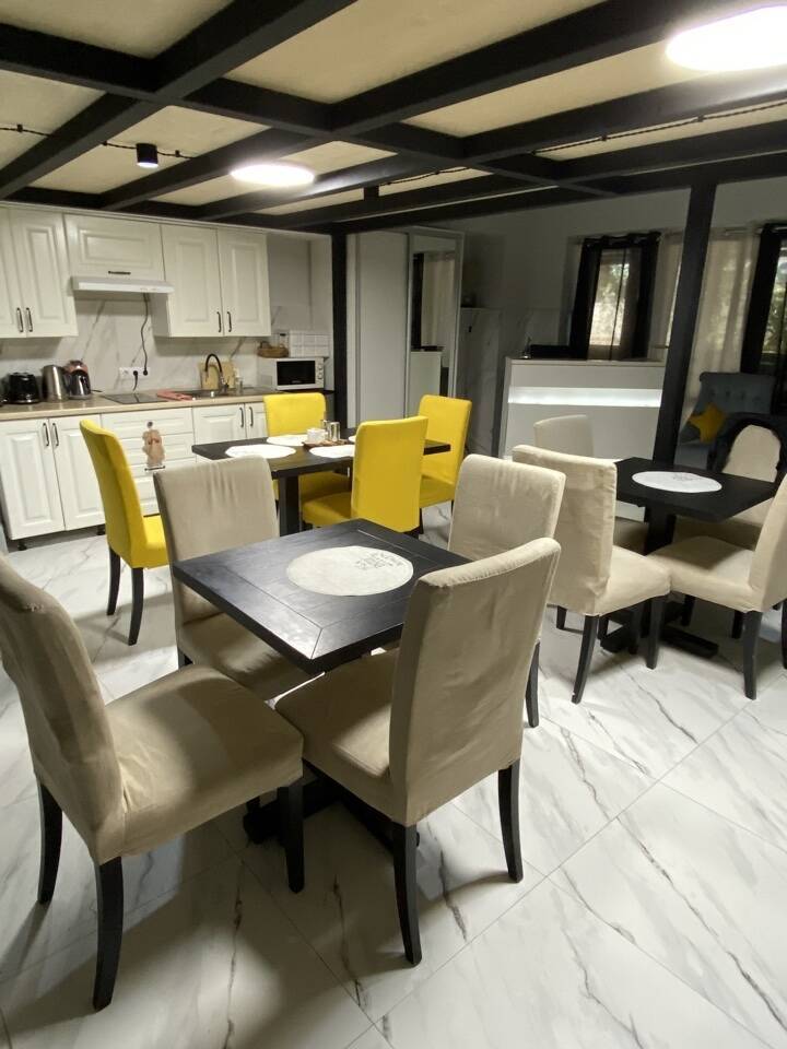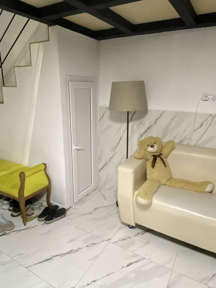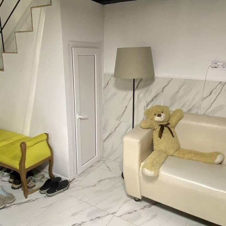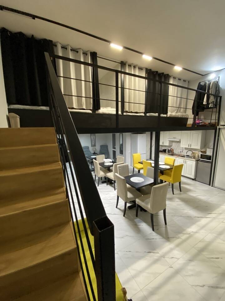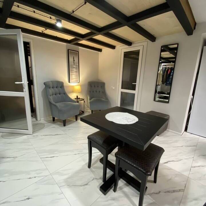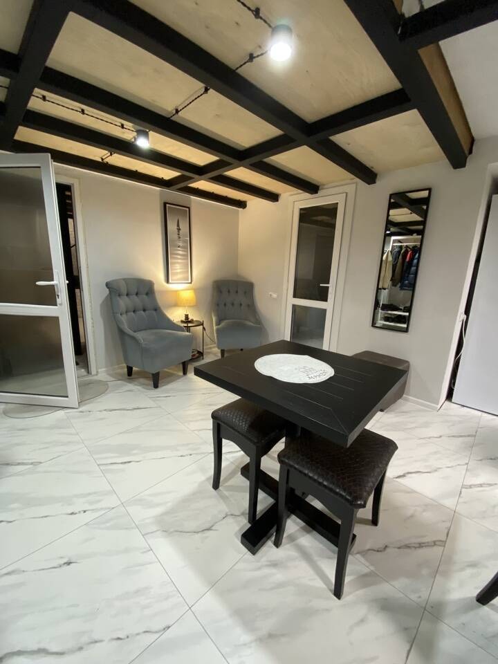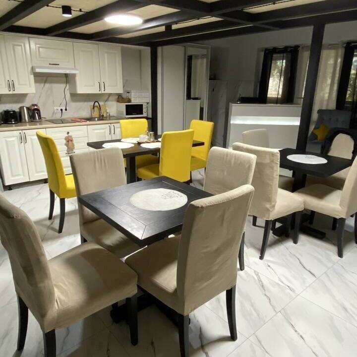 Полноценная кухня-гостинная, где можно приготовить еду. Плита, холодильник, микроволновка, чайник, посуда, кофемашина